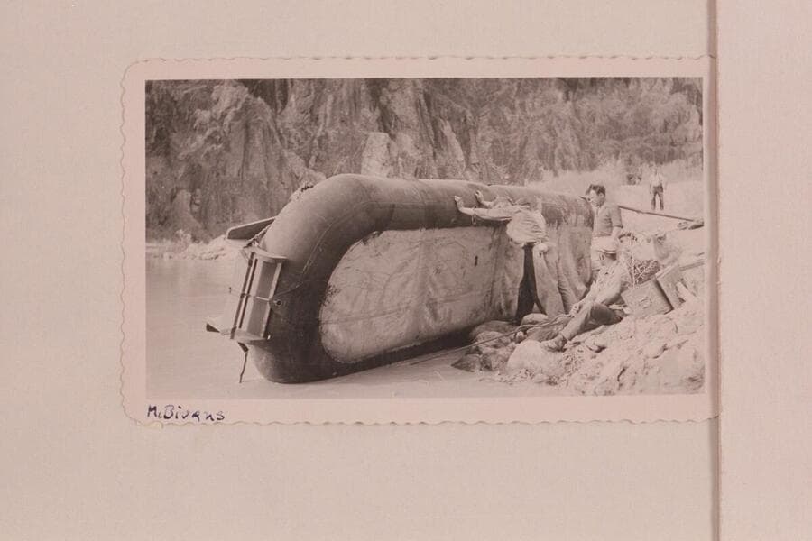 Patching one of the Bus Hatch boloney boats at Phantom Ranch. Bob Bader standing at right