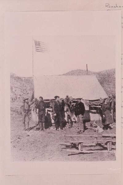Winter Headquarters of U. S. Colorado River Expedition 1871-1872 at Kanab, south Utah. In this headquarters tent the first map of the Grand Canyon region was put on paper by Thompson and Dellenbaugh with some work by Renshawe