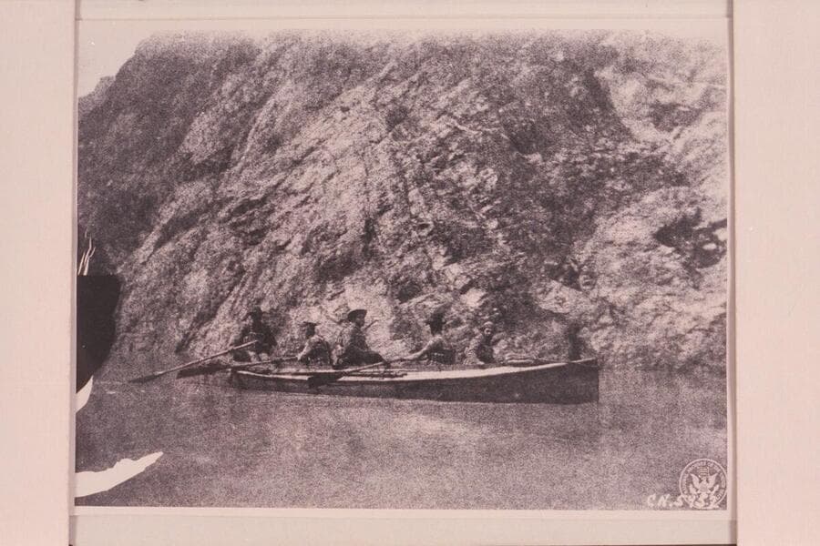 The "Bonnie Jean" below Crystal Creek. Stanton in the bow; Kane as bow oarsman; Ballard sittiing on the deck amidships, Gibson as stroke and Hogue as sweep
