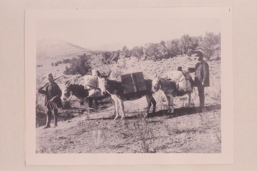 Arthur O. McCormick, left, and his brother, James, with their burro train on the trek from Denver to Seattle. Taken between Kremmling and Eagle, Colorado. Center burro carries photographic gear