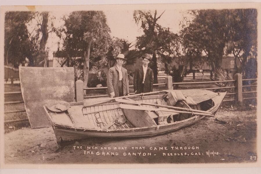 Charles Russell and Ed Monett with the steel boat "Utah" at the end of the trip. The trip started from Greenriver, Utah, in 1907. The sheet metal at left is the cover for the after section of the boat