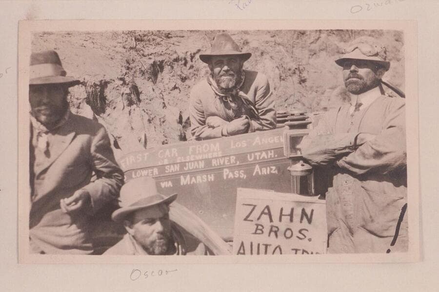 The Zahn party which took the Franklin car to the Zahn Mine on the San Juan River with the crop of "Spinach" after 6 weeks growth on a tour of 2089 miles. Hector, Oscar, Paul, Ozwald