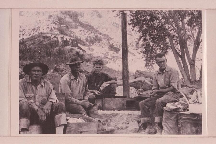 Camp at Rapid #37. 21.7 miles below mouth of Green River, 8:20 AM. Identification by Leigh Lint: Harry Tasker; Lint; Stoudt; and Clogston, members of the Chenoweth party surveying Cataract Canyon