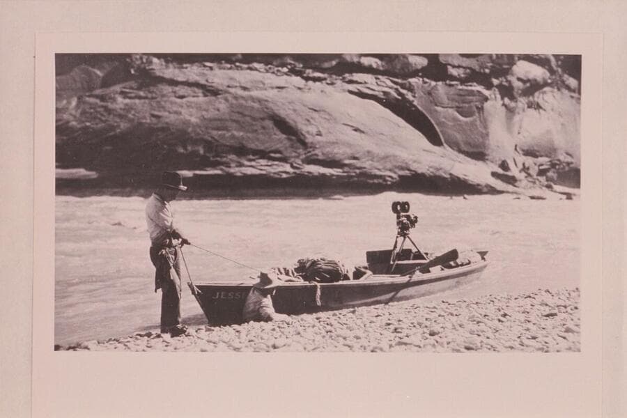 Skiff of Lasky party in small rapid just below Hite; Jesse Lasky, Jr. and Kenneth Wortley