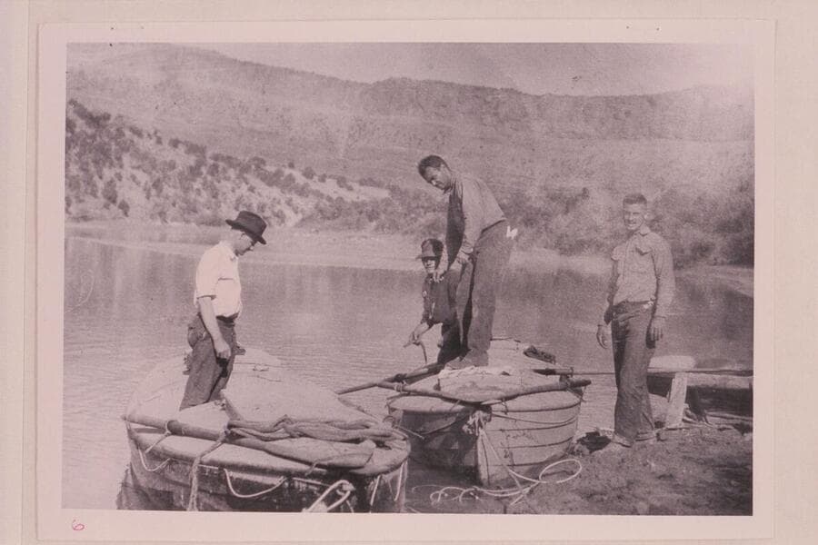Page-West crew of trip on upper Green River. Hale, Page, West, Blake, Todd