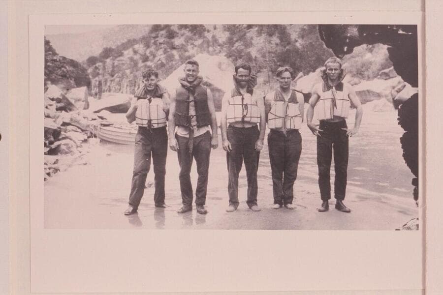 Page-West crew of trip on upper Green River. Hale, Page, West, Blake, Todd