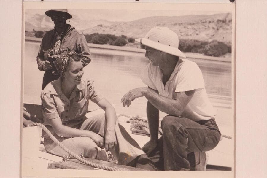 Doris Nevills and Norm Nevills posed during the run of 1940 from Green River, Wyoming, to Boulder City. Charley Larabee is in the background