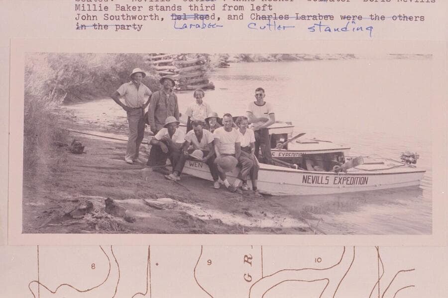 The Nevills party prior to departure from the beach above the D&RG trestle at Green River, Utah.Seated:Nevills, Reed, Anne Rosner;Goldwater; Doris Nevills.Millie Baker stands third from left.John Southworth,Larabee,Cutler, standing