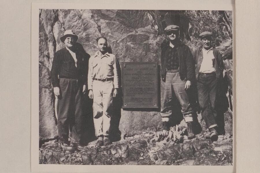 Ed Hudson, Harry Aleson, Hugh Brown and Fred Swenson at Separation Plaque after failure of Aleson's up-river attempt