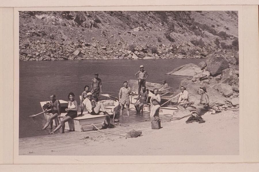 Boatmen of the Nevills party which had completed the runs of the Salmon and Snake Rivers in 1946: Dock Marston, Norm Nevills, Pres Walker and Kent Frost