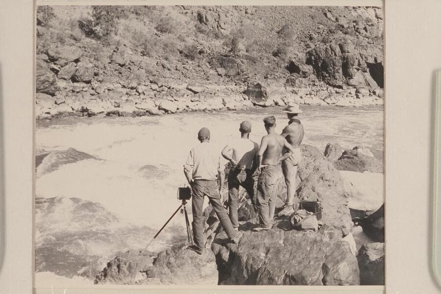 Oarsmen of the Nevills party in the Hell's Canyon at Eagle Bar: Nevills, Walker, Frost and Marston