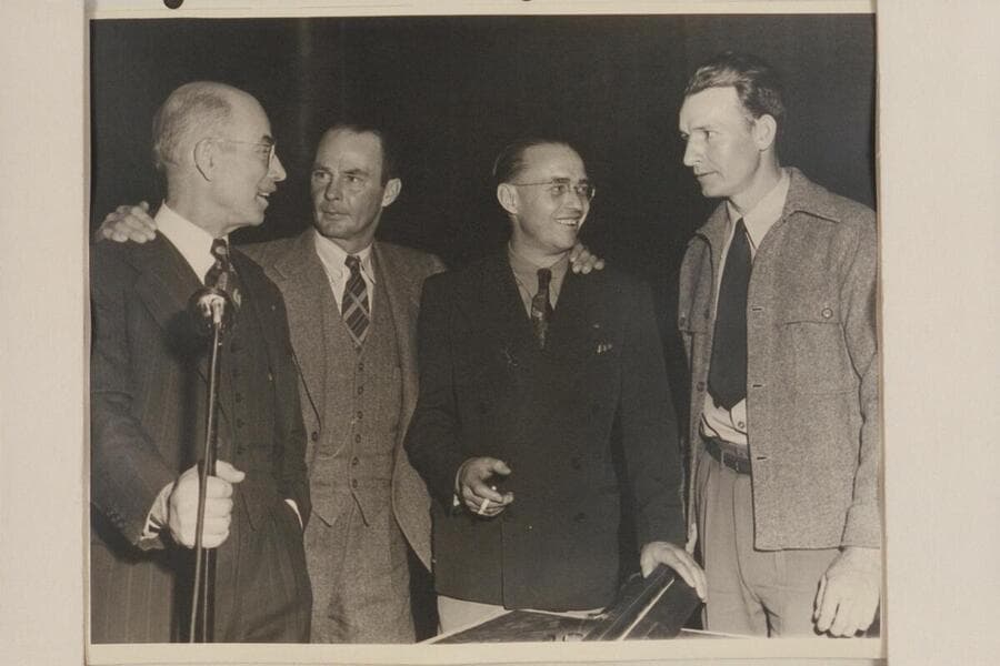 Boatmen of the Nevills party which had completed the runs of the Salmon and Snake Rivers in 1946: Dock Marston, Norm Nevills, Pres Walker and Kent Frost