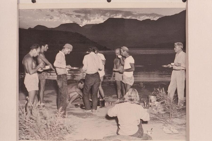 Zoe Desloge, Garth Marston, Anne Desloge at end of 1947 traverse of the Grand Canyon. At Pierces Ferry