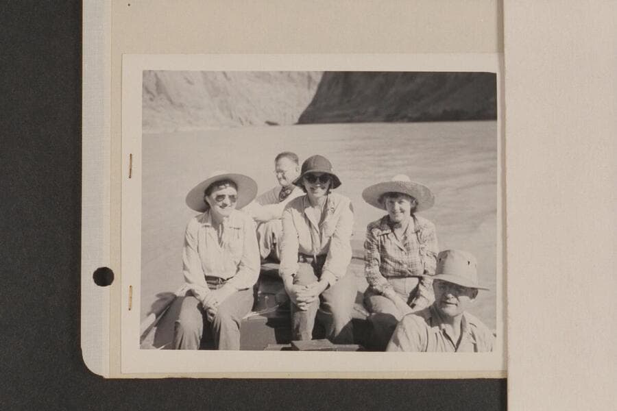 The "Esmeralda" starting on test run up into Glen Canyon. Left to right: Taylor; Mrs. Hudson; Mrs. Robinson; Ed Hudson; and Bestor Robinson