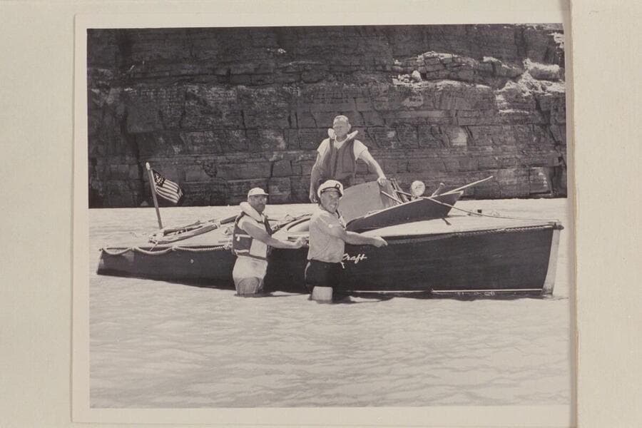 The crew of the "Boo" at Paria Riffle. Left to right: Guy Forcier; Joe Desloge; Joe Desloge; Frank Poettgen
