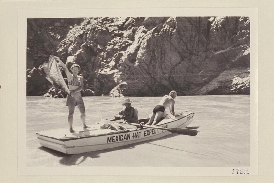 Frank Wright at the oars and Mary Beckwith riding the stern of the sadiron "Sandra", Upper Disaster Rapid