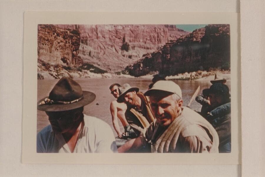 Launching the neoprene craft of the Hatch-Dines trip in 1954. Walt Emery; Tyson Dines; Allan Smith; Jim Nelson; Smuss Allen; and Bus Hatch. Lees Ferry