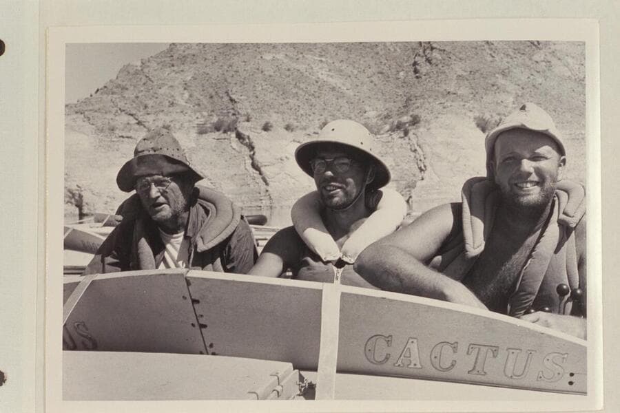Crew of the "Cactus." Willie Taylor; Jorgen Visbak; Bill Belknap. Grand Canyon traverse of 1954, June. Gods Pocket, Lake Mead
