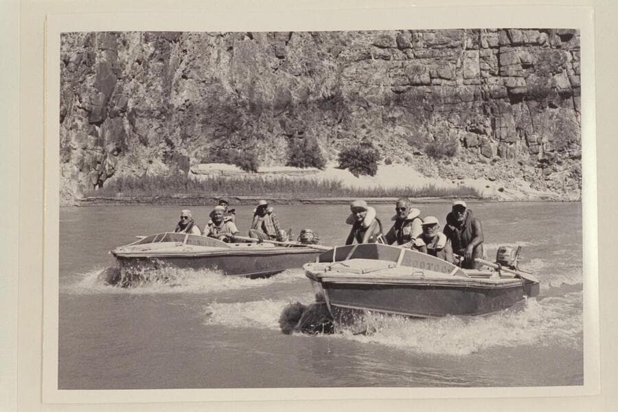 The "Rattlesnake" and the "Bootoo" cruising on upper Lake Mead. Joe Desloge; Rod Sanderson; Argwen Bundy; and Hugh Cutler are in the "Rattlesnake." Spence Cavalliere, Joe Eisaman, Dock Marston, and Frank Masland in the "Bootoo."