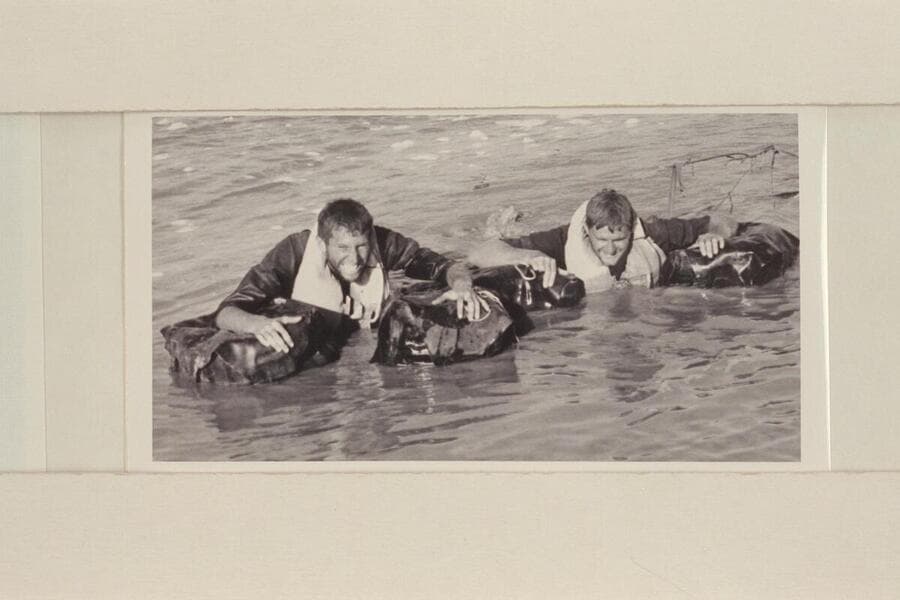Daggett and Beer demonstrating their water wings with which they traversed the Grand Canyon in 1955, Apr.-May. Lower end of Grand Canyon about 2 miles above Emory Falls