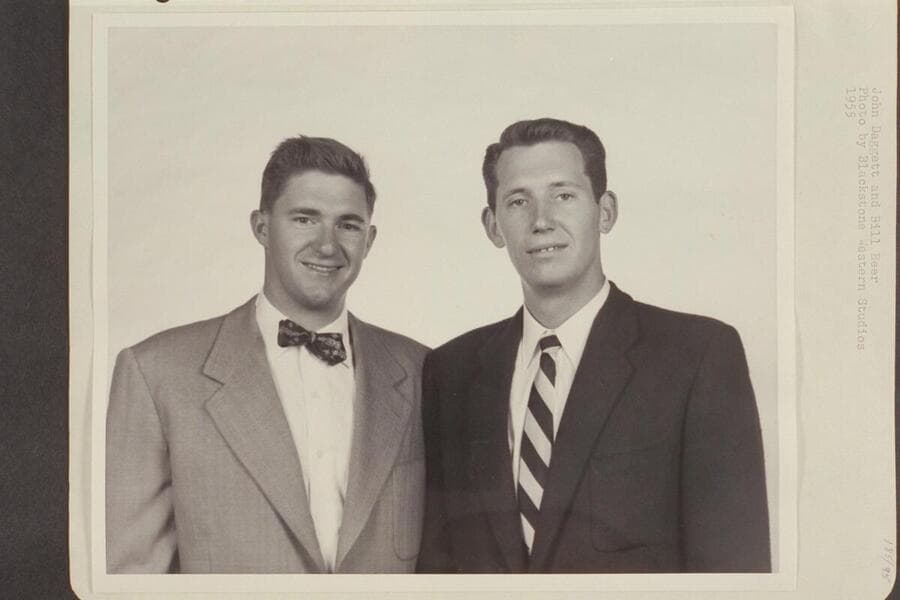 Bill Beer and John Daggett at the end of their traverse of the Grand Canyon. Grapevine Wash. The rubber bags held gear and food and provided flotation