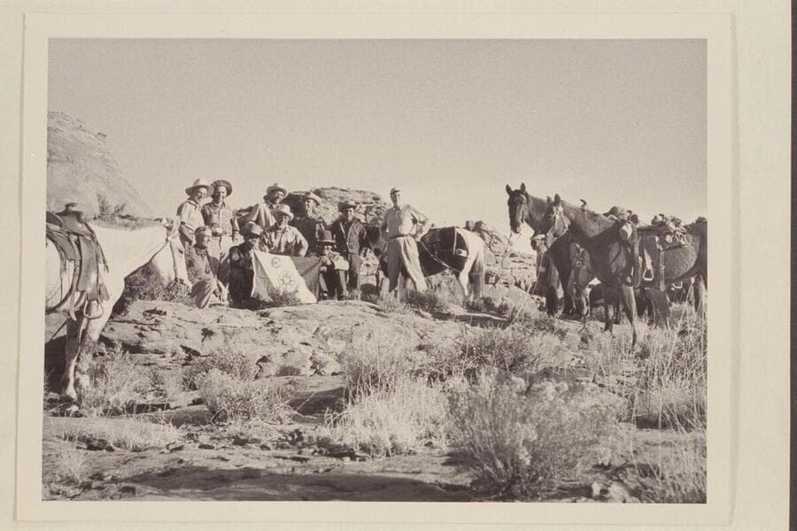Trail party at camp in cave upstream from Rainbow Bridge: Tom Daly, Ballard Atherton, Jorgen Visbak, Frank Masland, Hugh Cutler, Joseph Desloge, Marston