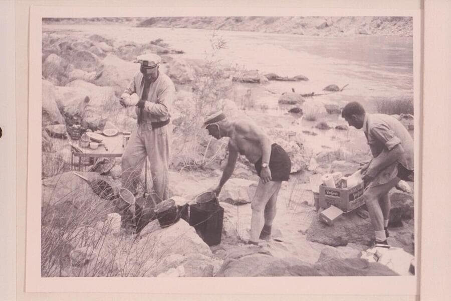 Bathing the dishes in the second camp in Marble Canyon: Sanderson, Marston and Beer; President Harding Rapid
