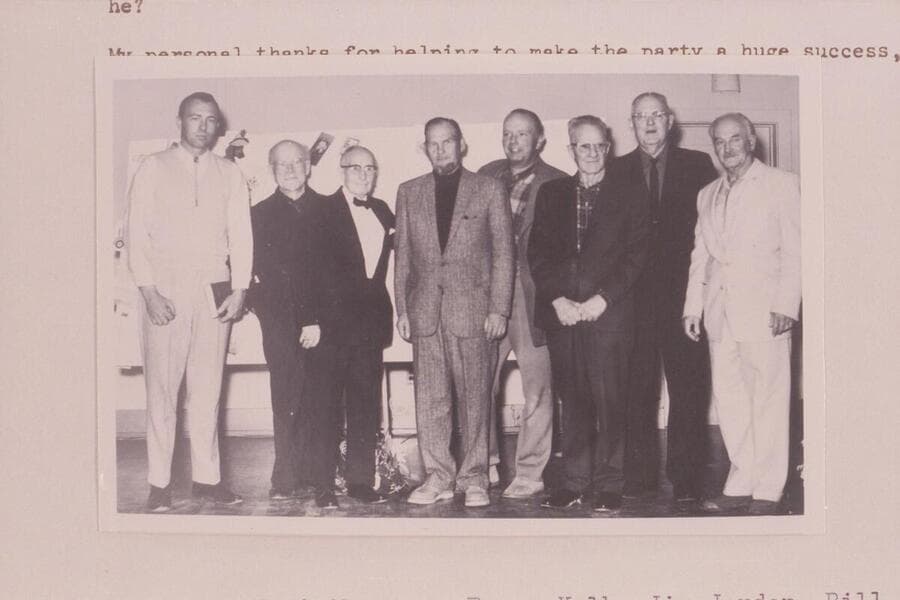 Gay Stavley, Dock Marston, Emery Kolb, Jim Jordan, Bill Belknap, Elwyn Blake, Ed Hudson and Harry Aleson at Emery Kolb's 85th birthday party