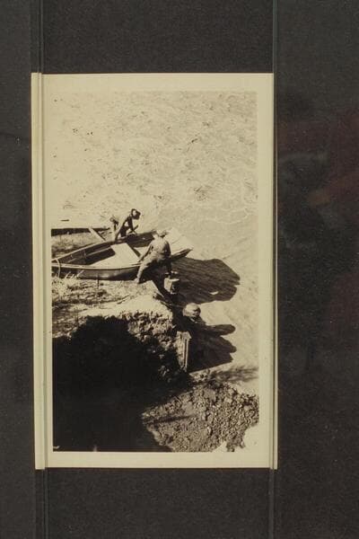 "Boulder" and "Glen" after portage of Lava Cliff Rapids. Felix Koms (cook) on boat