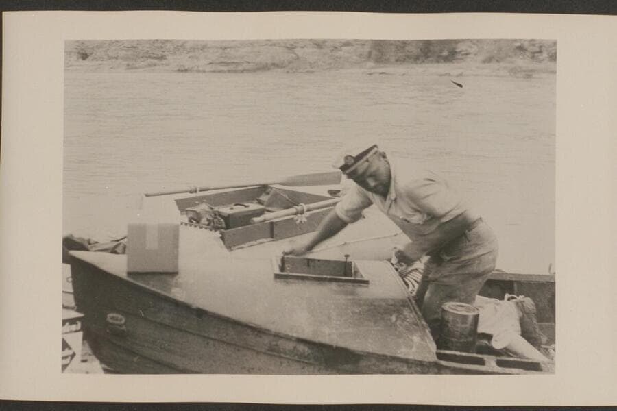 Buzz Holmstrom's boat at Green River, Wyoming below the rail trestle where he started his solo run