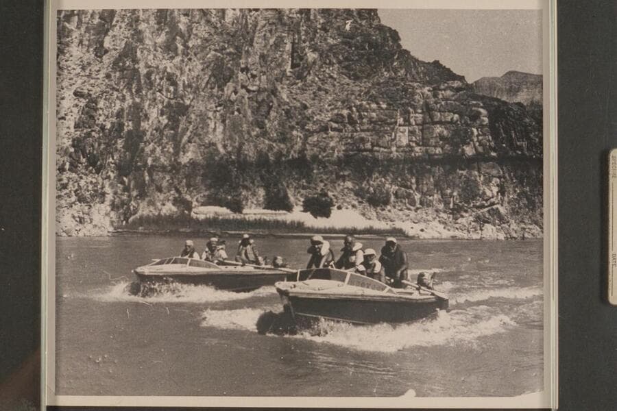 The "Rattlesnake" cruising below President Harding Rapid. Left to right: Hugh Cutler; Joe Desloge; Rod Sanderson