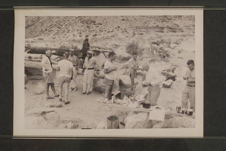 Crew in camp at head of Soap Creek Rapid: Masland, Taylor, Marston, Sanderson, Marston, Beer, Desloge and Cutler