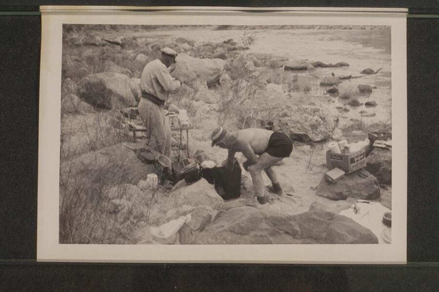 Bathing the dishes in the second camp in Marble Canyon: Sanderson, Marston and Beer; President Harding Rapid