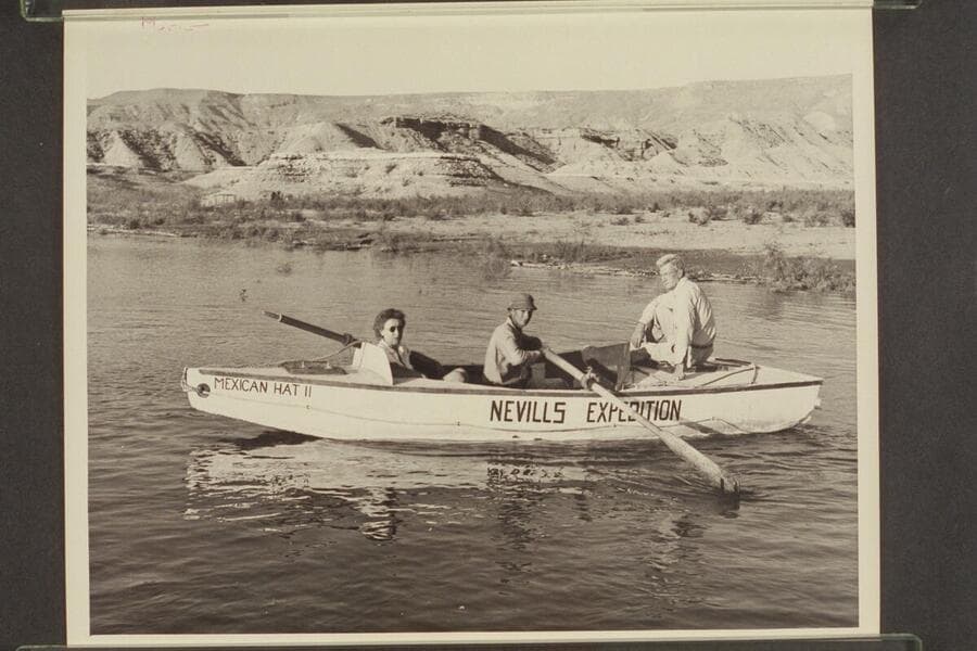 Crew of the "Mexican Hat II" at Pierces Ferry after end of Grand Canyon traverse of 1947. Left to right: Marie Saalfrank, Kent Frost and Joe Desloge