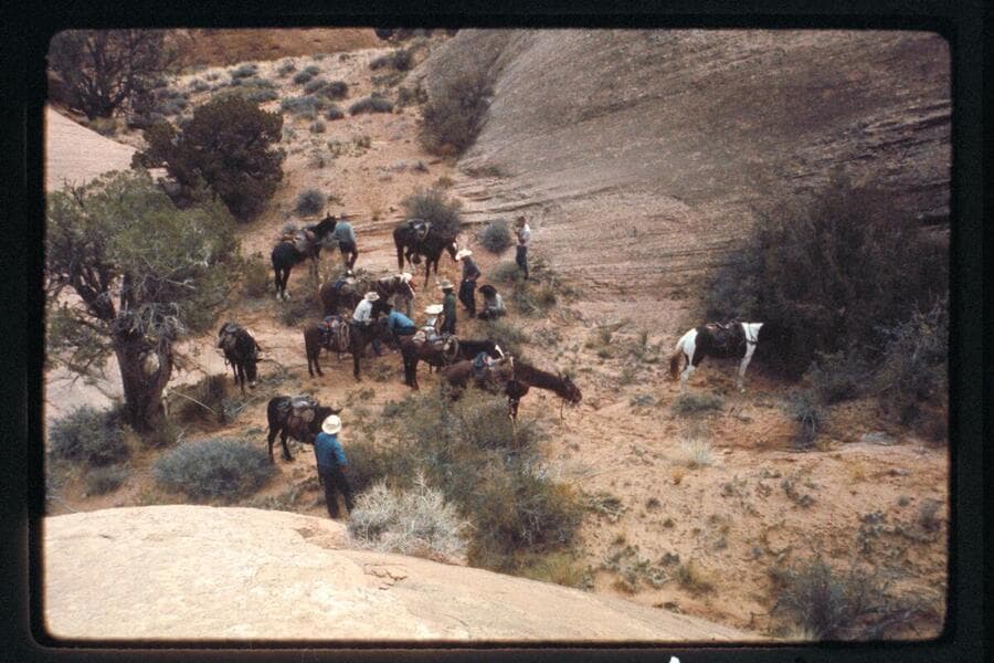 Repairs to Tom Daly's horse after fall on slick rock. West of Nasja Creek