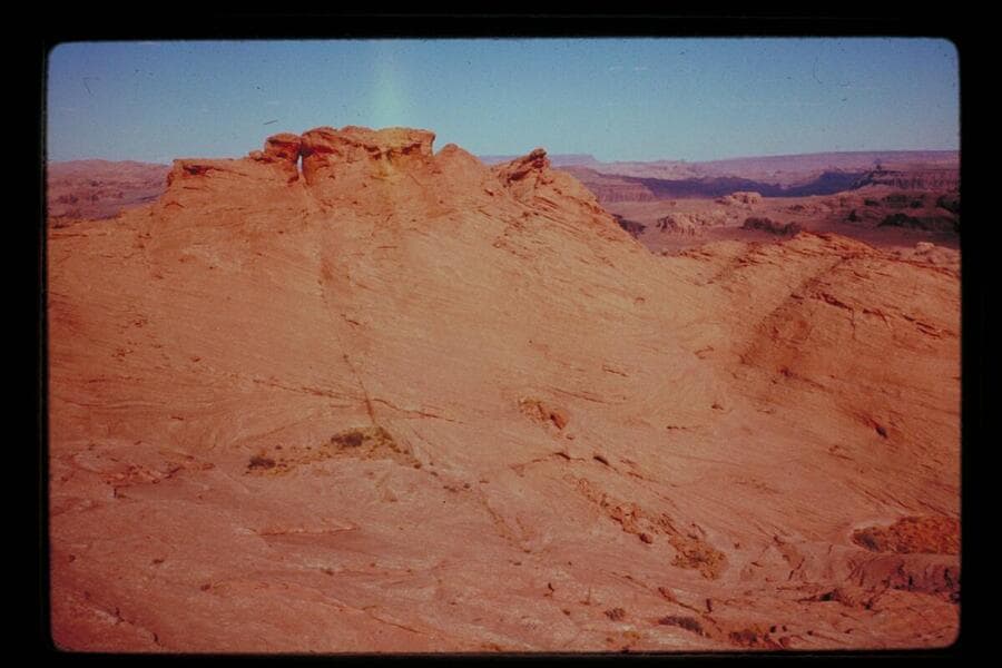 Formation at rim of plateau southwest of Nasja Creek, Navajo Mountain. The sloping mesa at center is 4903 between Bald Rock Creek and Nasja Creek