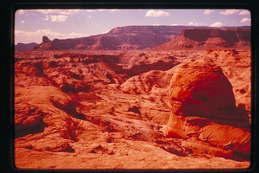 Down canyon at Mile 74. Across Glen Canyon to Lion Rock at left; Fifty Mile Mountain at upper center and Sixty Mile Point at upper right