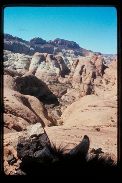 Across the northeast fork of 73.6--Lehi Canyon. The notch in upper right center is the trail into the middle fork. Anasazi Canyon
