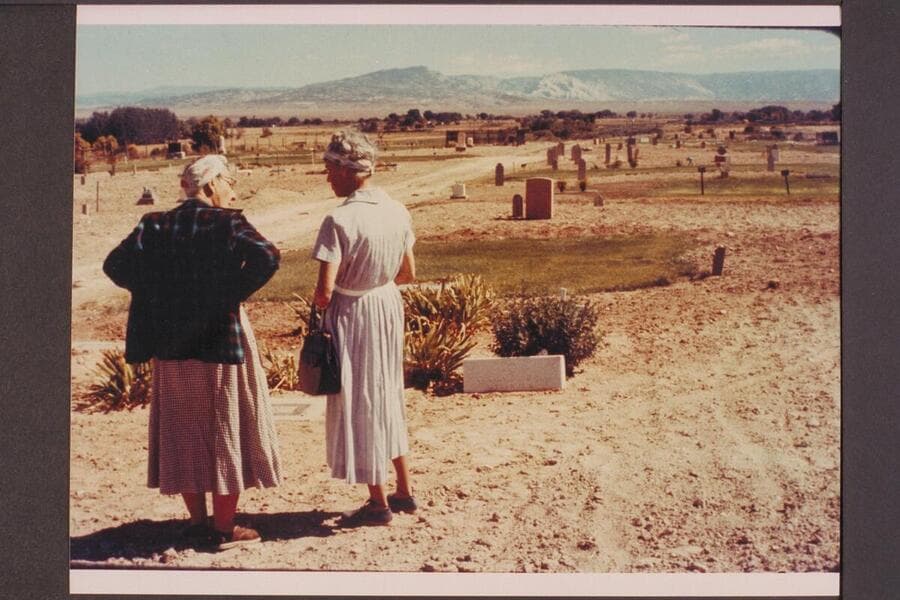 Dora Goodman and Margaret Marston at grave of Frank V. Goodman