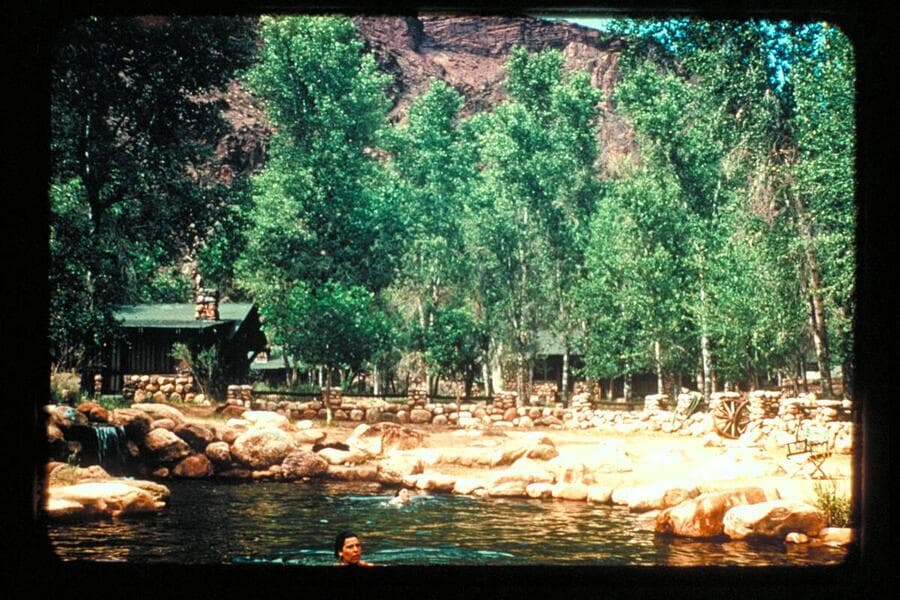 The pool at Phantom Ranch. The cabins of the Ranch. Dock Marston at pool