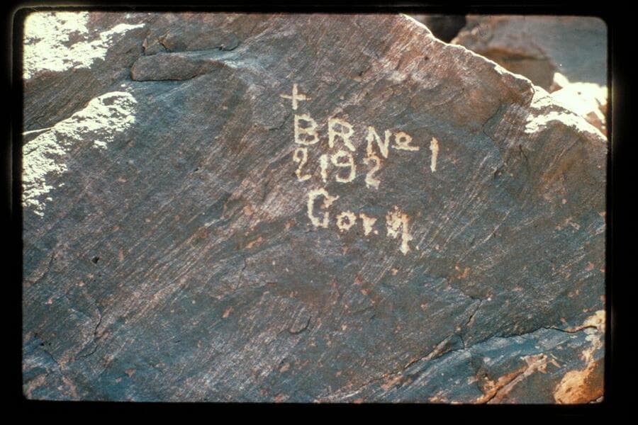Inscriptions at right bank below Hance Rapid; Mile 77.1-77.5. Probably location markers for the Hance Mine