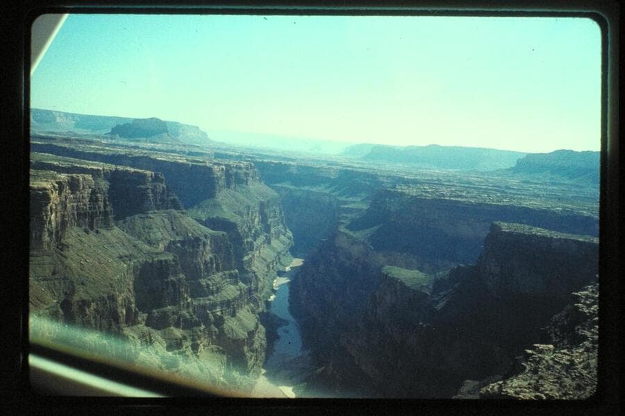 Upriver from about Mile 170. The Dome at left and Mt. Sinyala in the distance. Flatiron Butte right of center