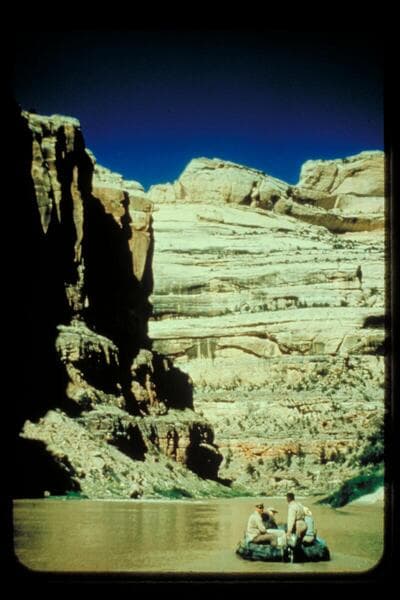 Bus Hatch running a motor on a 10-man inflated boat. Four miles below Mantle's Ranch on the Yampa River