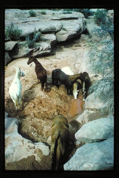 Art Ekker's stock watering at the tanks at the head of Horsethief Canyon