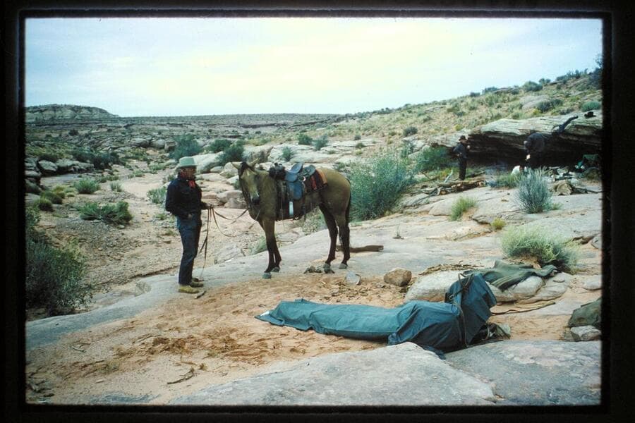 Art Ekker's stock watering at the tanks at the head of Horsethief Canyon