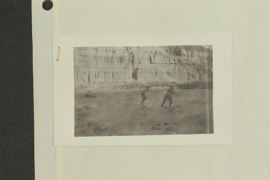 Stone's visit to Glen Canyon. One man by a boat, two men pulling boat upstream