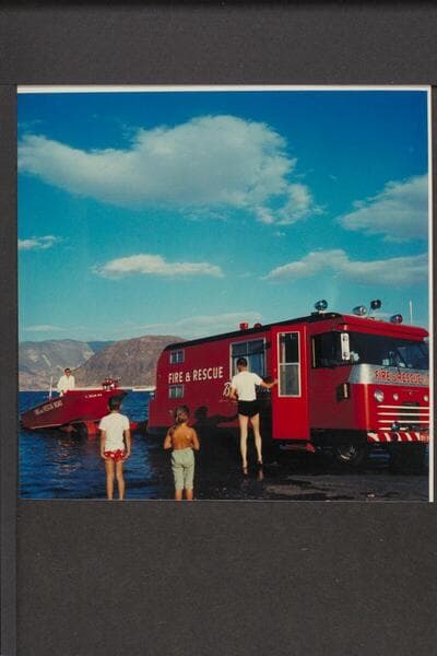 Bill Austin in the boat directing the launching of the jet fire boat. Boat landing at Boulder City