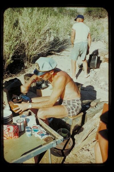 John Schulz passes the word to Chuck Richey, Brian Rowlands grinds coffee at right; Mile 70