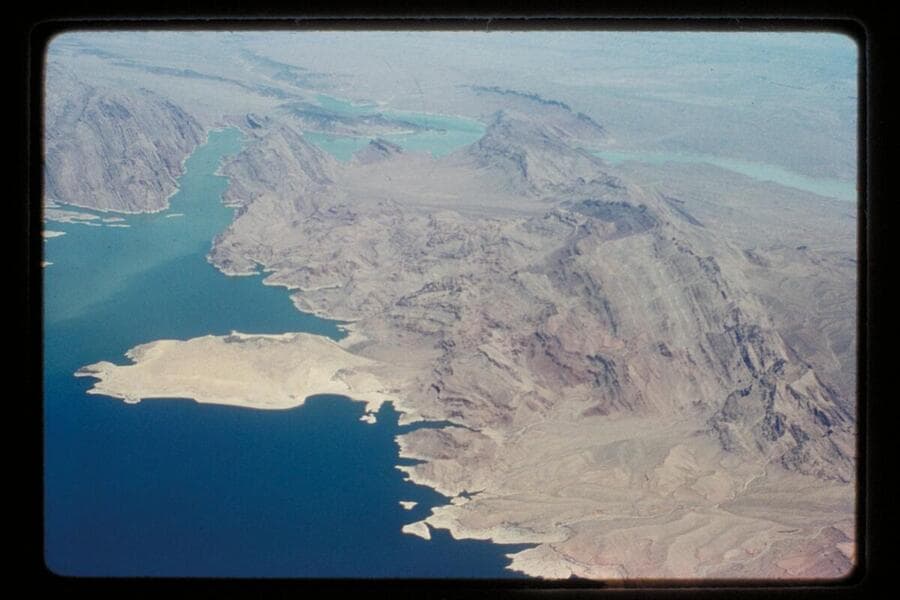 Looking down Lake Mead to right of Iceberg Canyon. Sandy Point in middle distance. The silt shows in the water down past Sandy Point