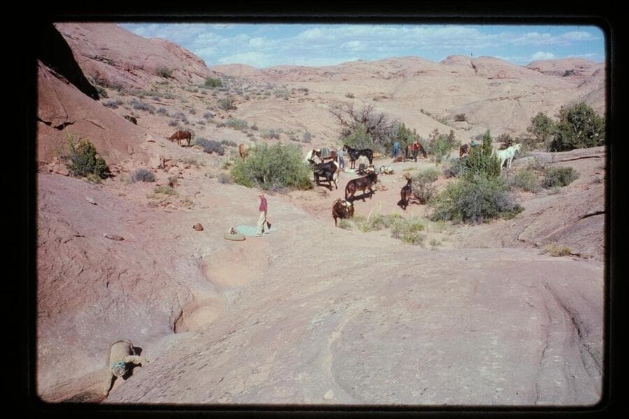 Stock on slick rock west of Nasja Creek and below Dead Center Camp